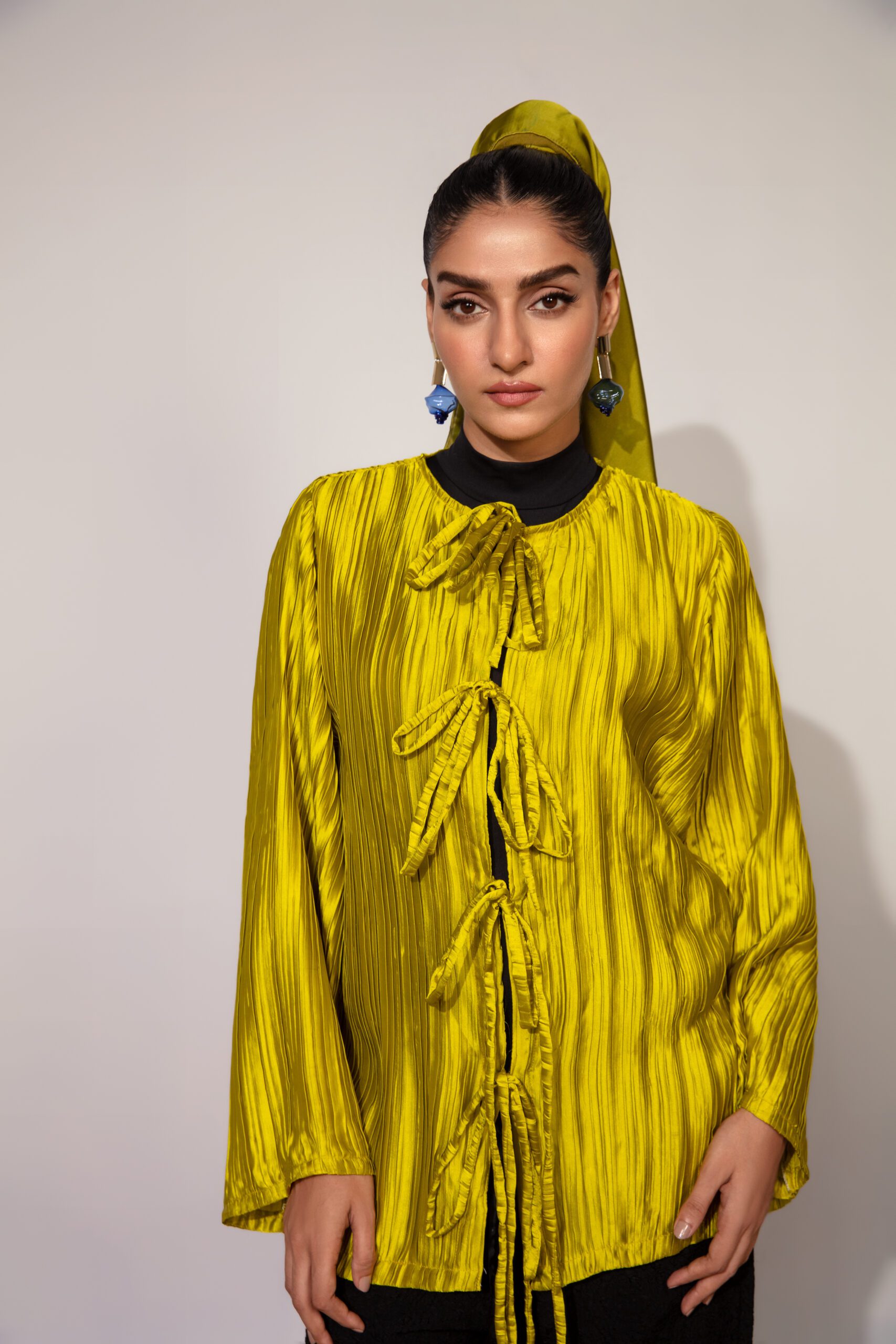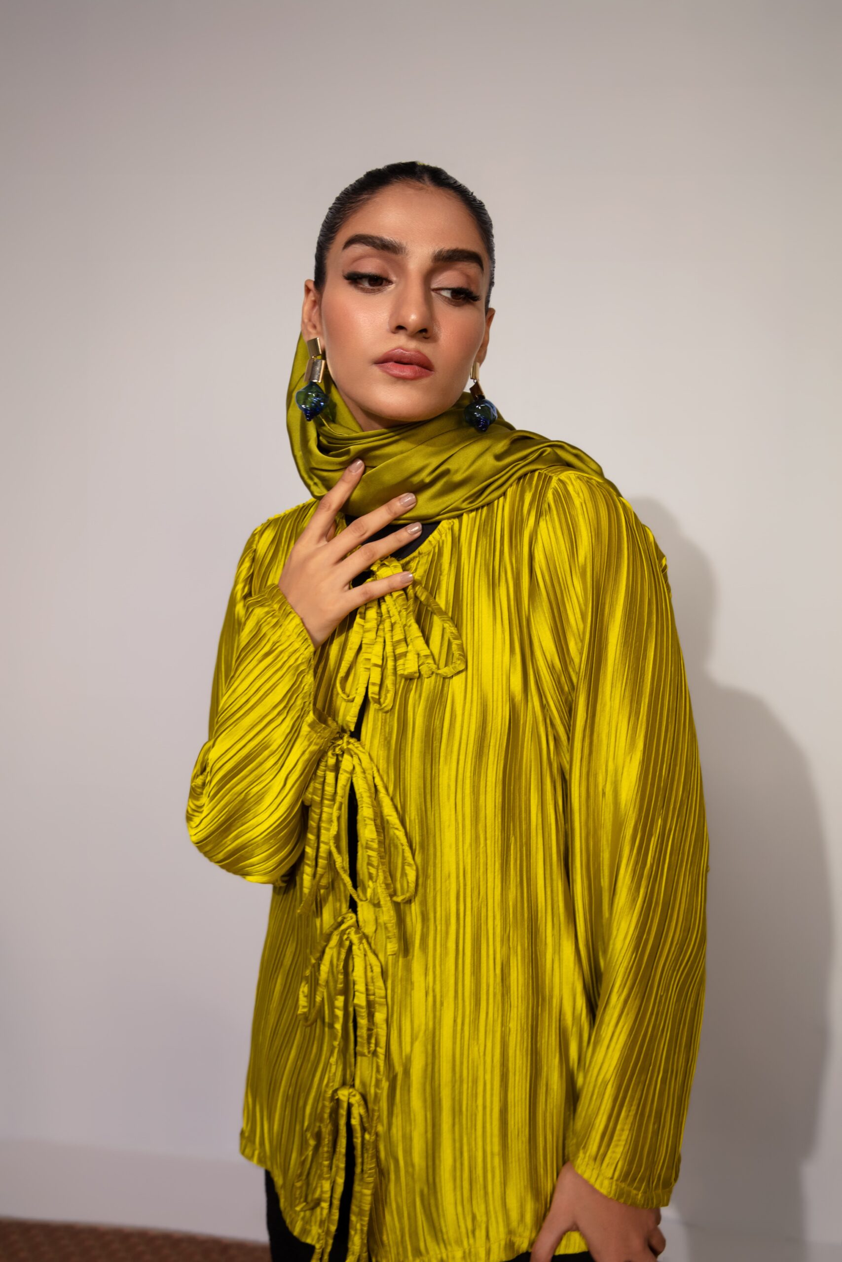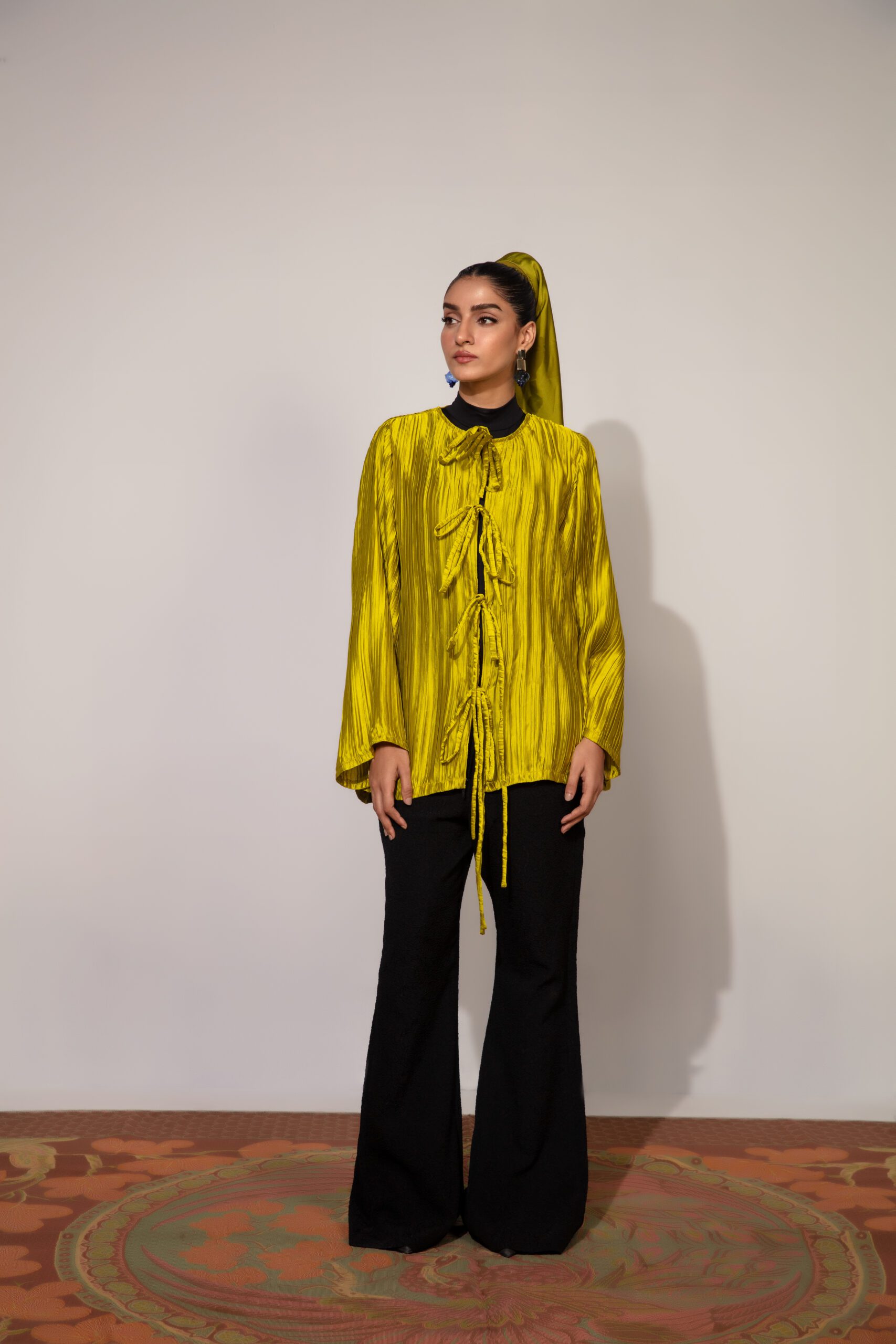 The Limelight blouse by Zelo is a stunning front-open top crafted from crinkled silk, designed for a sophisticated yet relaxed look. It features adjustable knots for a customizable fit and long, wide sleeves that add an elegant touch to its overall design.