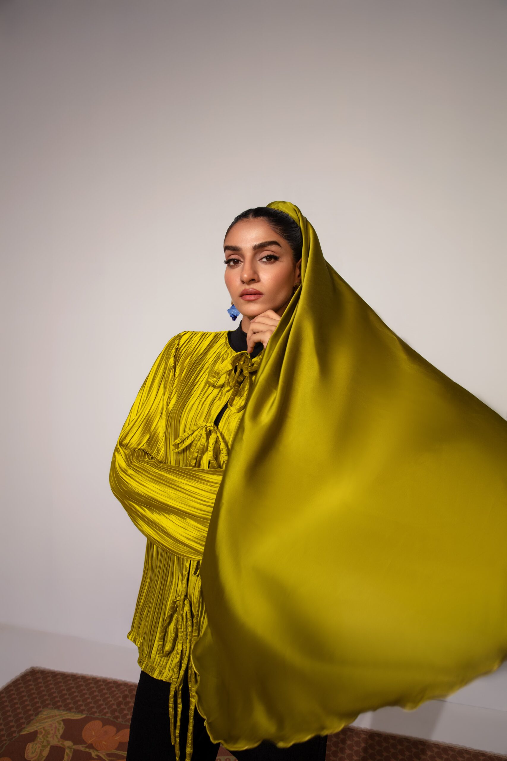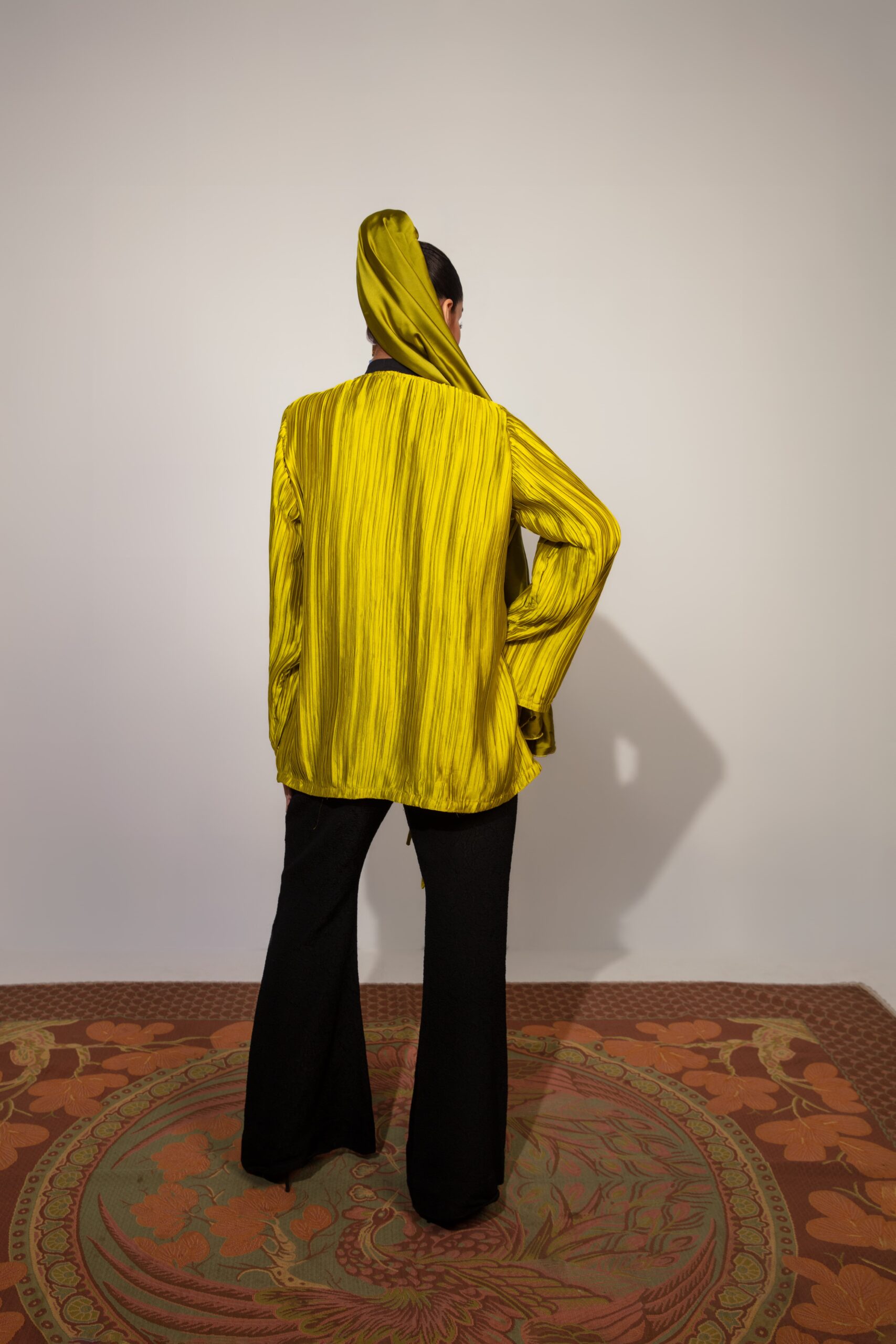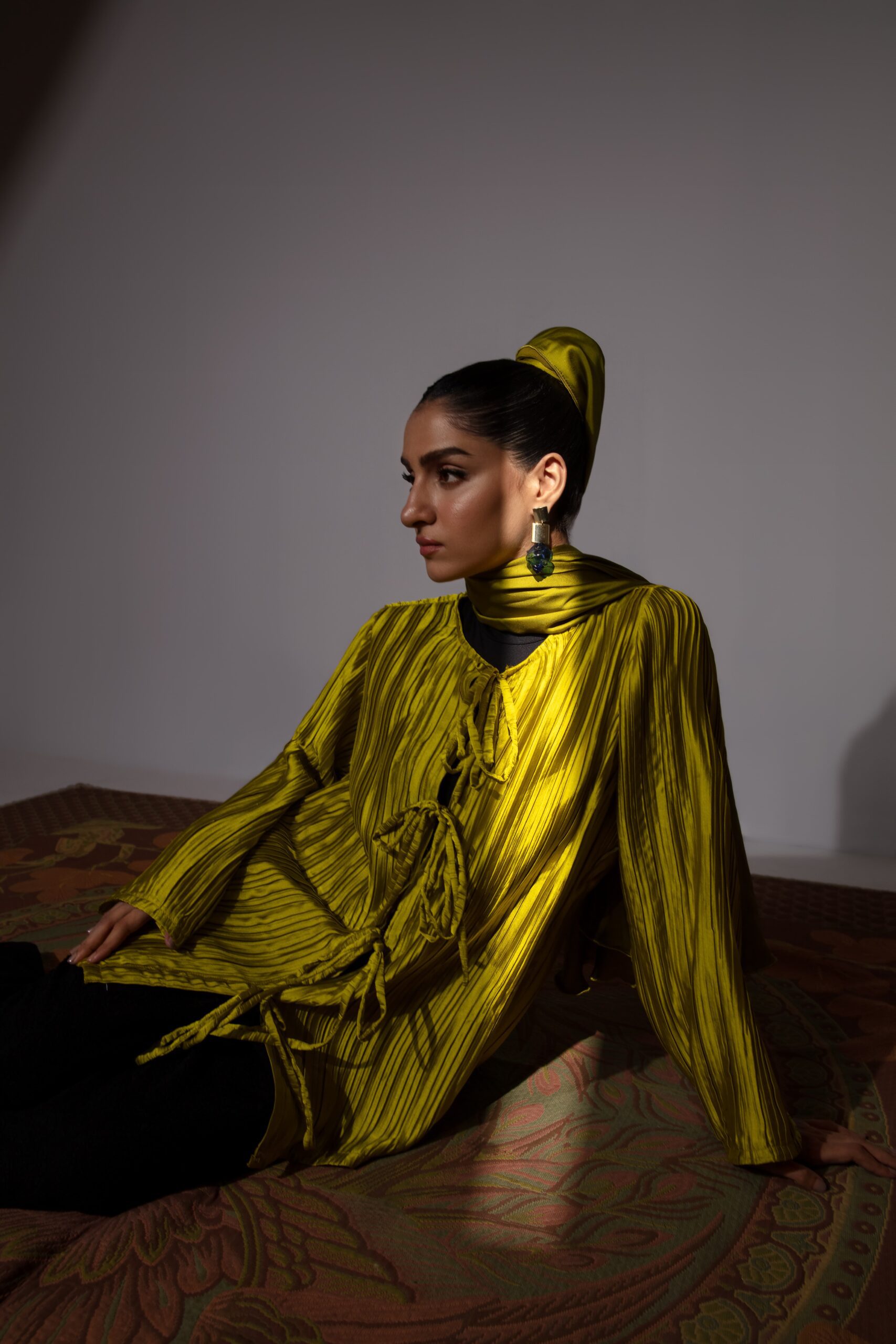 The Limelight blouse by Zelo is a stunning front-open top crafted from crinkled silk, designed for a sophisticated yet relaxed look. It features adjustable knots for a customizable fit and long, wide sleeves that add an elegant touch to its overall design.