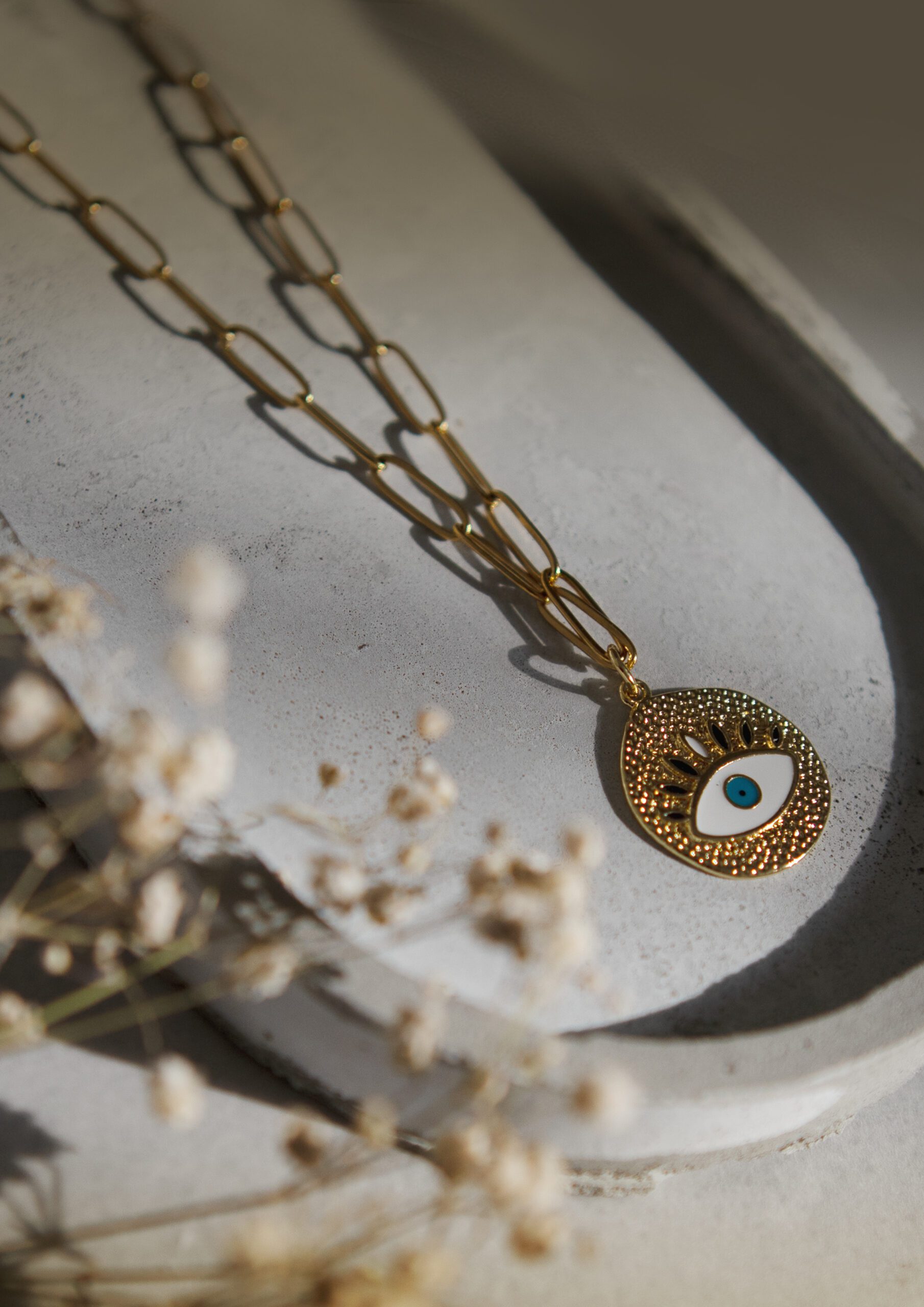The Mystic Gaze Necklace by Zelo is a bold and captivating piece featuring a chunky gold eye pendant, symbolizing protection and insight. The pendant is elegantly suspended from a sleek gold chain, creating a striking statement accessory.